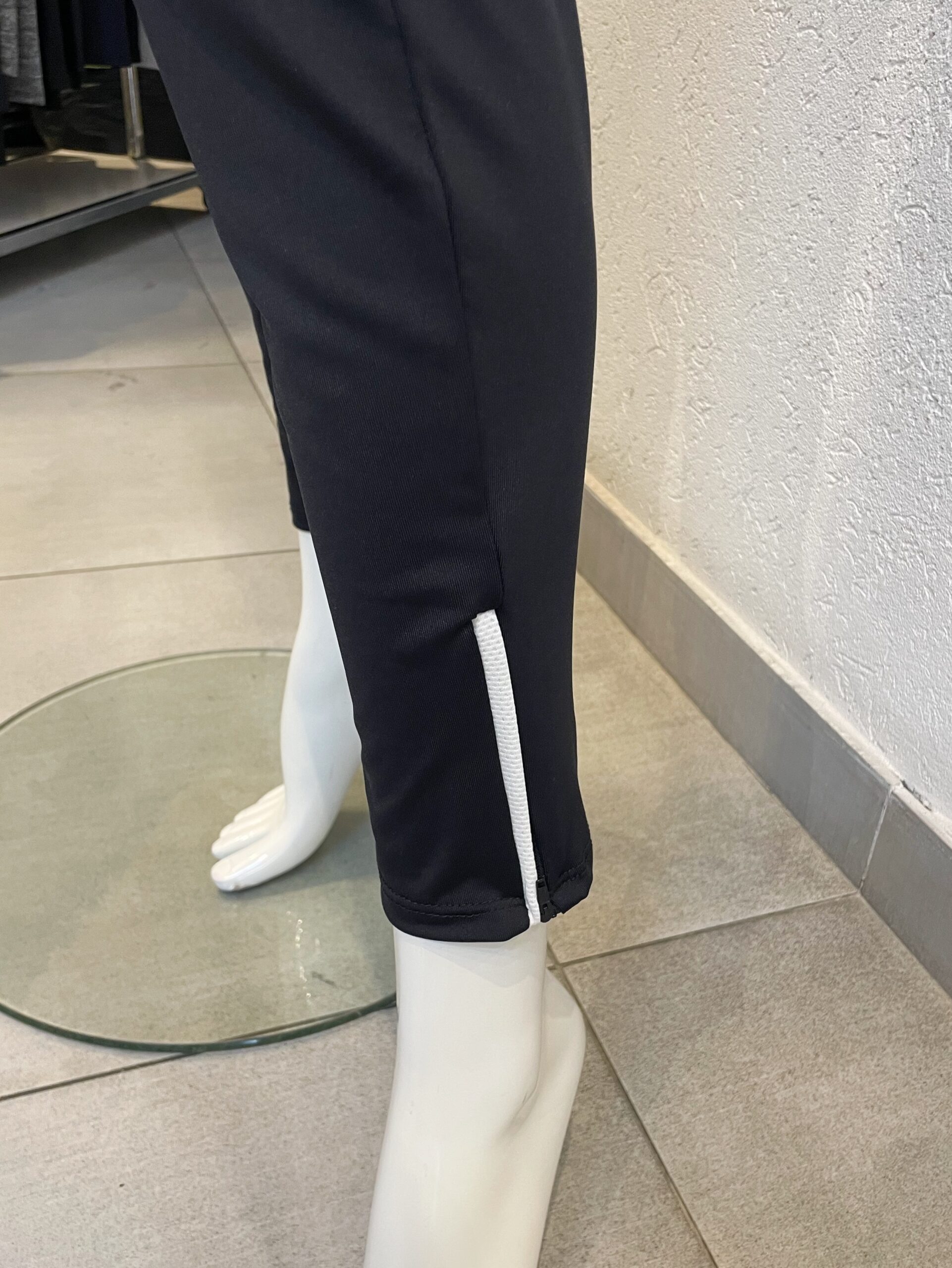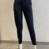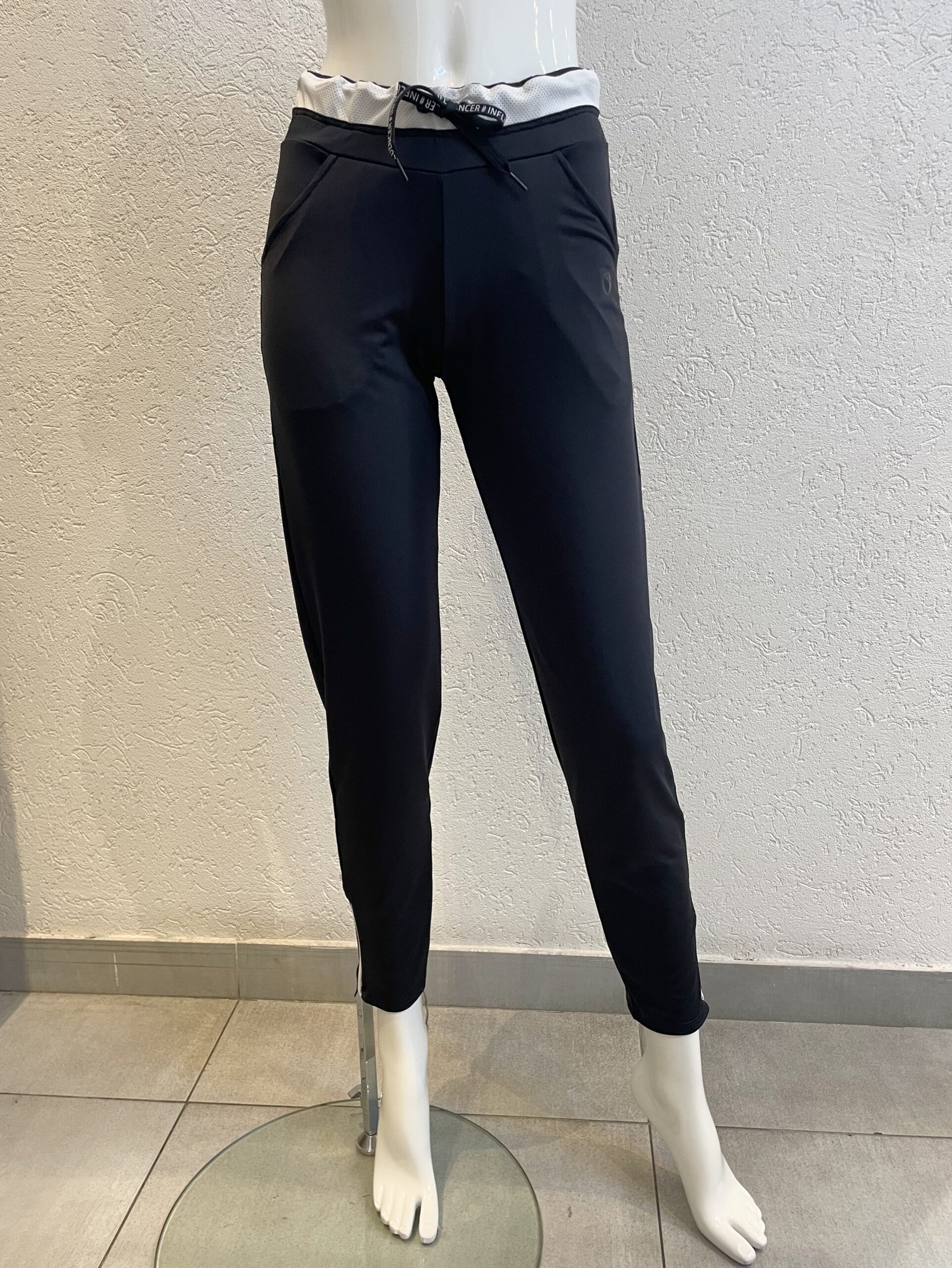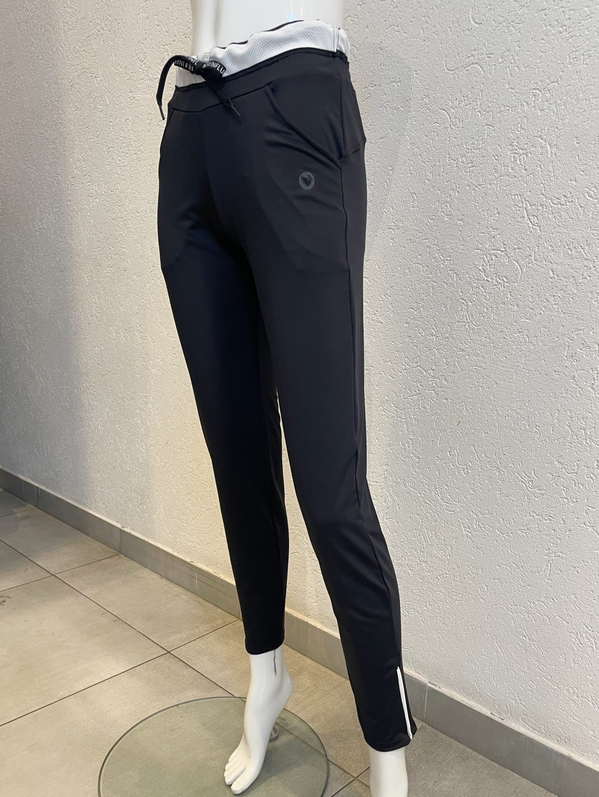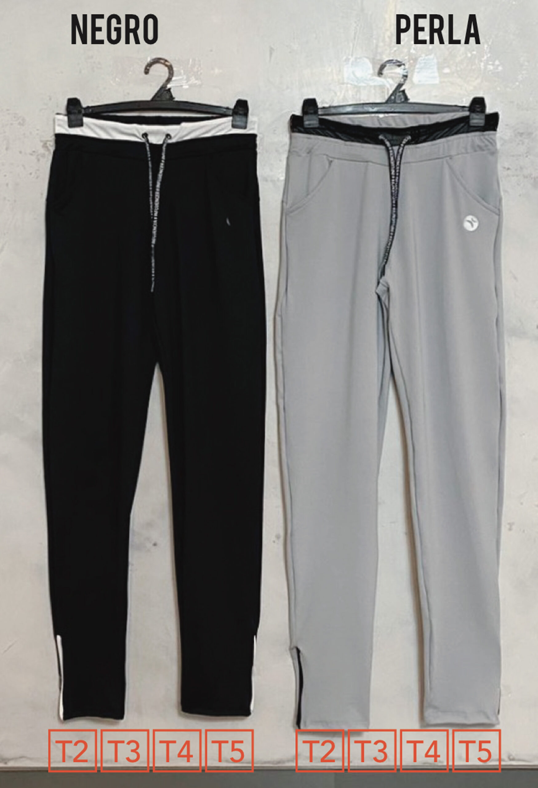 Pantalón semi chupín supplex lycra con cintura combinada y cordón; tiene cierres en botamangas